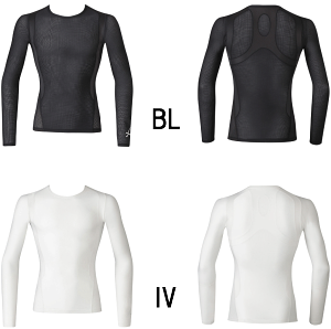 【サイズ】 M チェスト88〜96 身長165〜175 L チェスト96〜104 身長175〜185 【特徴】 ジュウリュウトップ(メッシュタイプ) ラウンドネック(長袖) サポート部位:肩甲骨、広背筋、腹斜筋 本体部分にメッシュ素材を使用し、脇切り替え部分は大穴メッシュ構造で、熱・ムレを逃して涼しく快適。