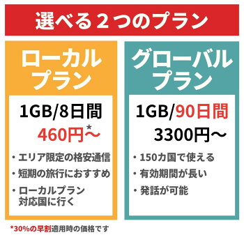 【選べるお得なプラン】 様々な国に行く方は全対応国で使えるグローバルプラン、 旅行、出張は格安のローカルプランがおすすめです。