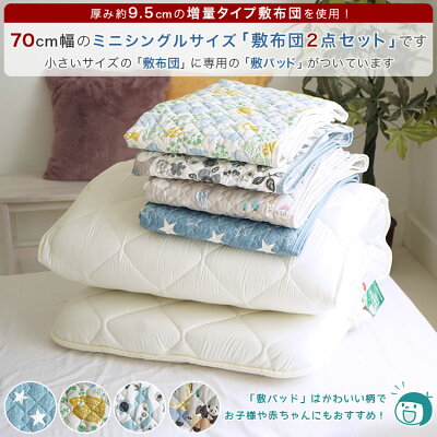 合わせて使える同サイズの ▼「敷布団カバー」はこちら▼ 通常タイプの敷布団 2点セット ▼ベビーからジュニアまで使える「トドラーサイズ」 ▼「小さいサイズの敷布団」シリーズ中身増量タイプ 70cm幅サイズのミニシングル敷き布団用 敷き布団 2点セット ボリュームタイプ ・防ダニ 敷き布団(ミニシングルサイズ : 70×200cm) ・綿100% 敷パッド (ミニシングルサイズ: 70×200cm) マンションなどの省スペースの収納にも便利な 当店で人気の70cm幅ミニシングルサイズの「敷布団」に 専用の「敷きパッド」をお付けした2点セット! 急な来客用や、届いたその日からすぐにお布団を使いたい! という方にもオススメです。